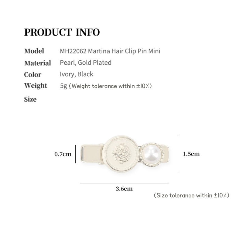 Martina Mini Hair Clip Pin features cute pearls and classic details in a tiny size. This adorable clip pin captures Melabianca's unique charm. It's easy to match with any outfit and hairstyle, making it perfect for everyday use! :)